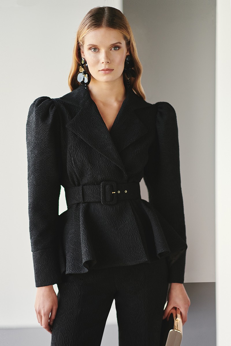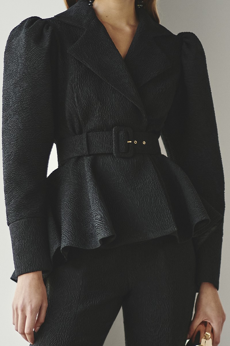 Traje formado por dos piezas, chaqueta y pantalón, confeccionado en un precioso tejido jacquard brocado en color negro. (...)