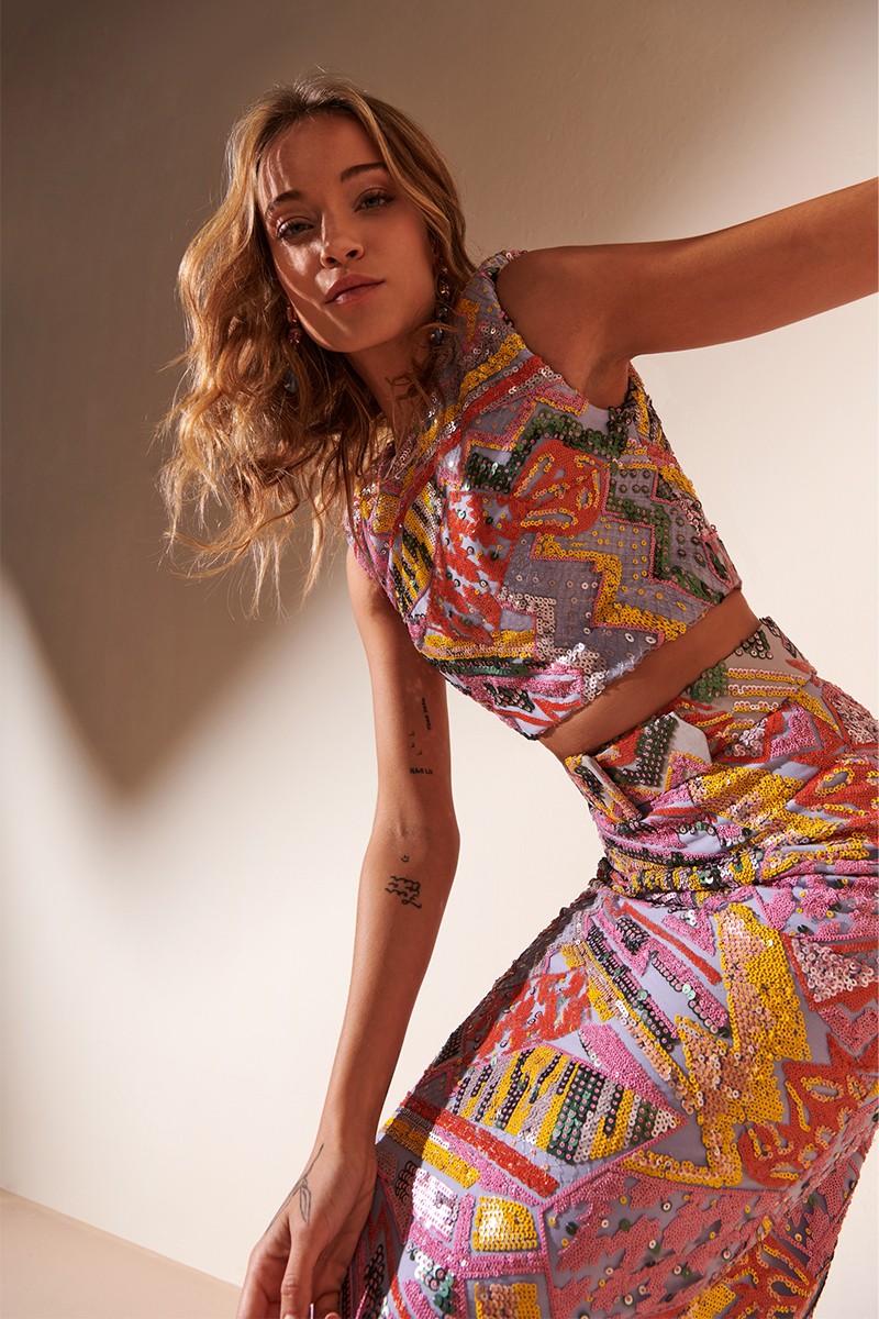 Precioso conjunto confeccionado en lentejuela geométrica de colores naranjas, amarillos y rosa sobre un crepe de color azul de gran calidad. (...)