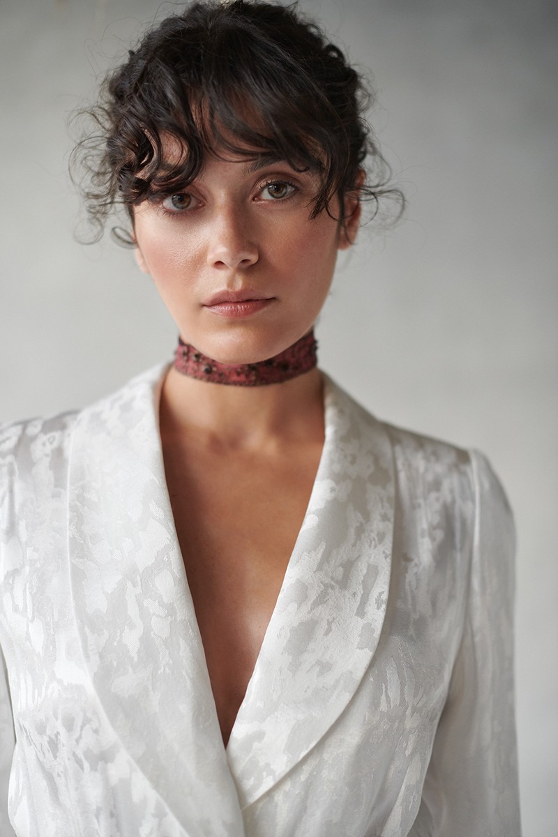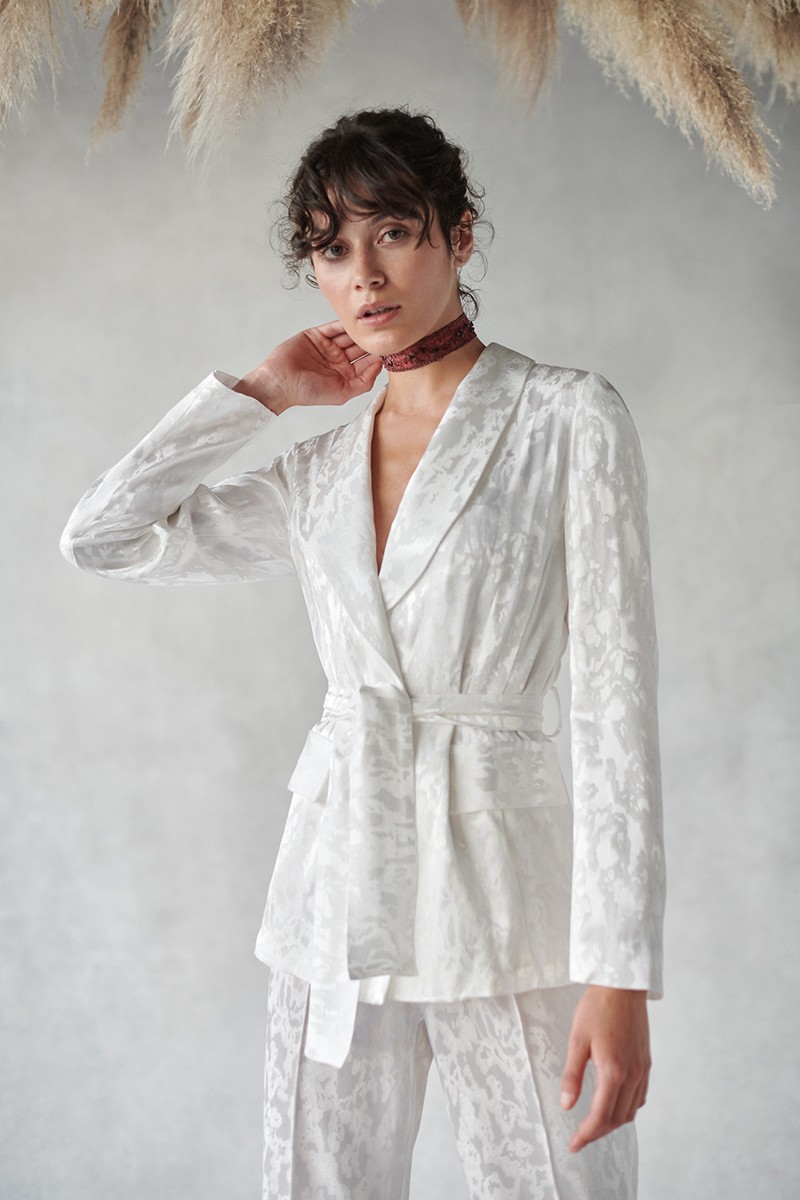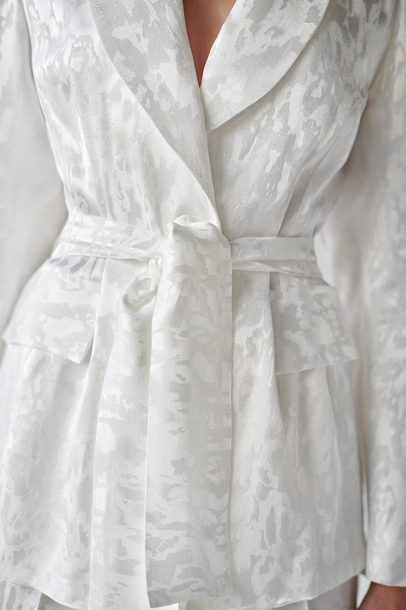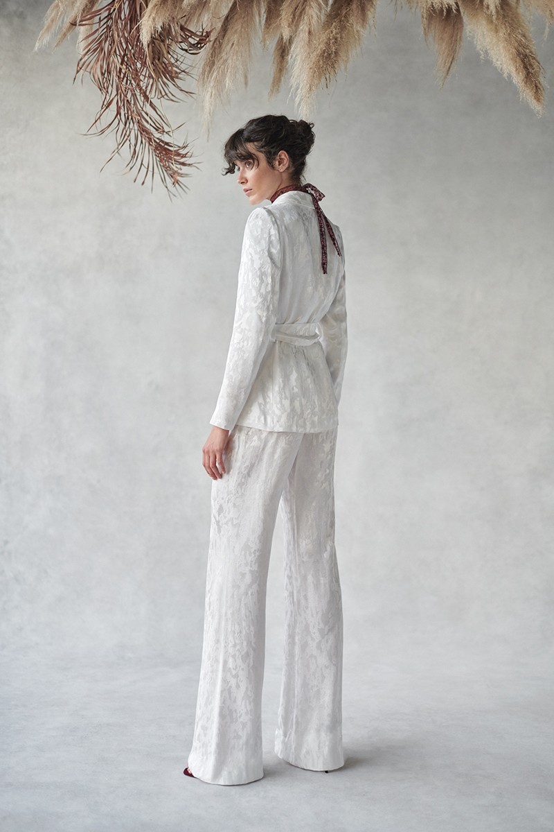 Espectacular Traje formado por dos piezas, chaqueta y pantalón, confeccionado en un precioso tejido jacquard tussord tornasolado en color blanco. (...)