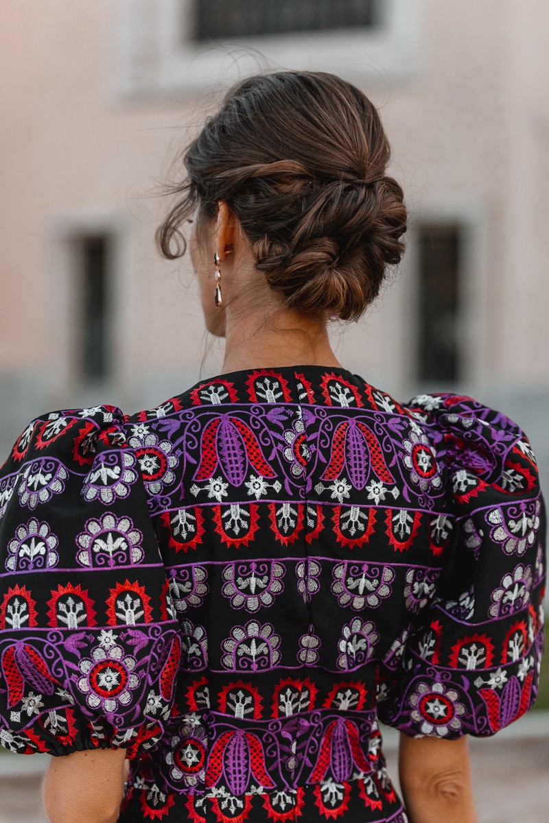 Precioso vestido de fiesta confeccionado en tejido de crepe negro con bordados en color rojo y morado de motivos étnicos. (...)