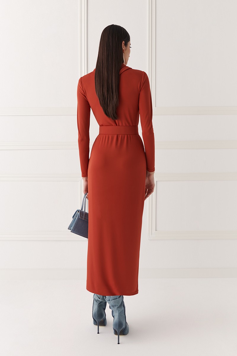 Precioso vestido midi confeccionado en un tejido de punto de seda color teja.Tejido de gran calidad (...)