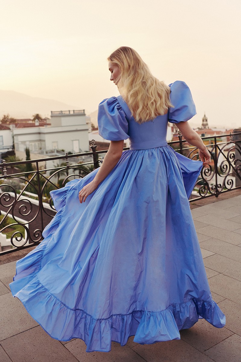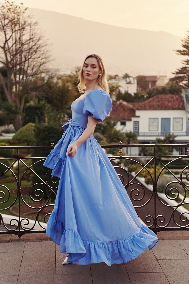 Impresionante vestido largo confeccionado en tafetán de alta calidad de color azul lavanda. (...)