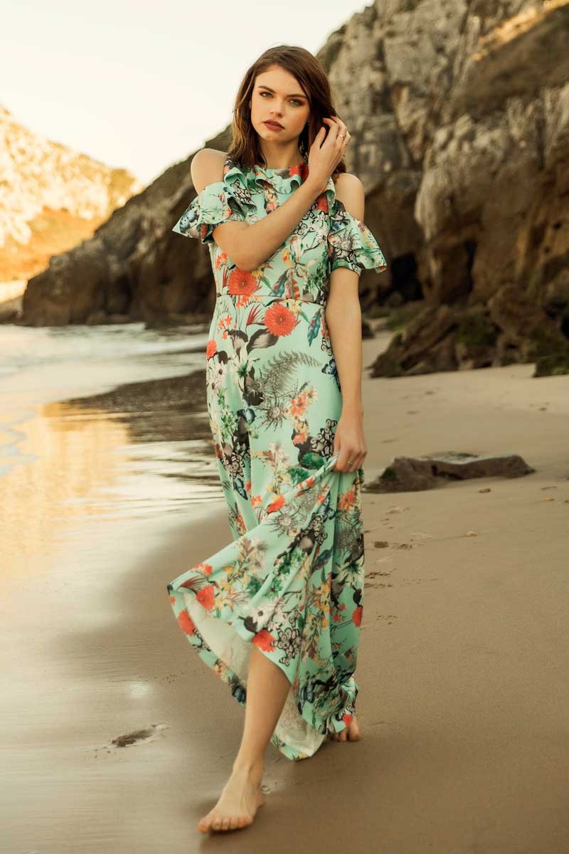 Maravilloso vestido largo azul claro con estampado de mariposas y flores, confeccionado en crepe satén de excelente calidad. Cuello a la caja con volantes que continuan por la manga (...)
