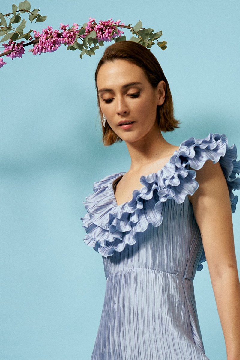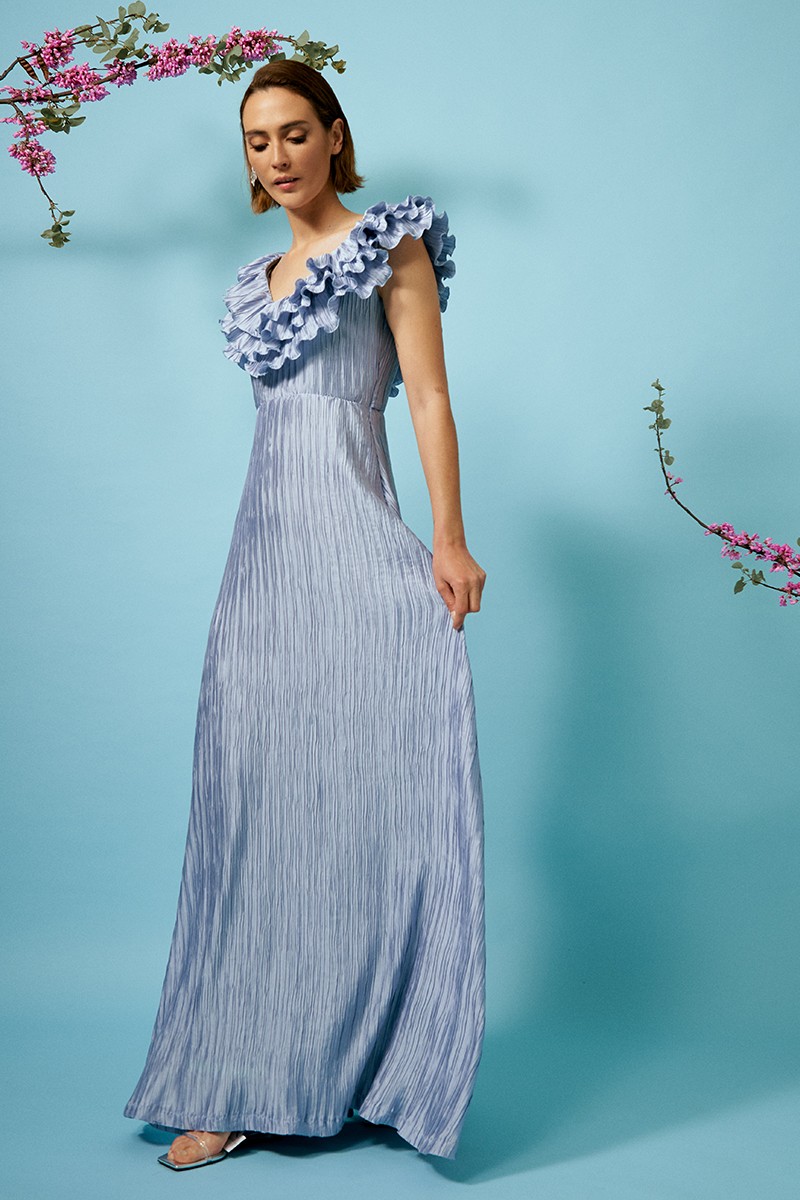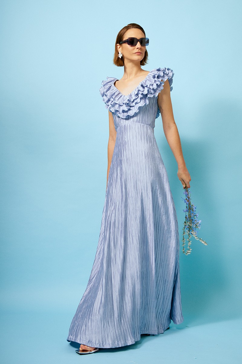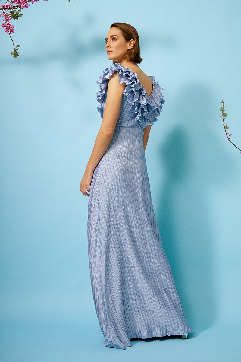 Espectacular Vestido Largo con volantes confeccionado en un tejido satinado plisado de alta calidad de color azul claro. (...)