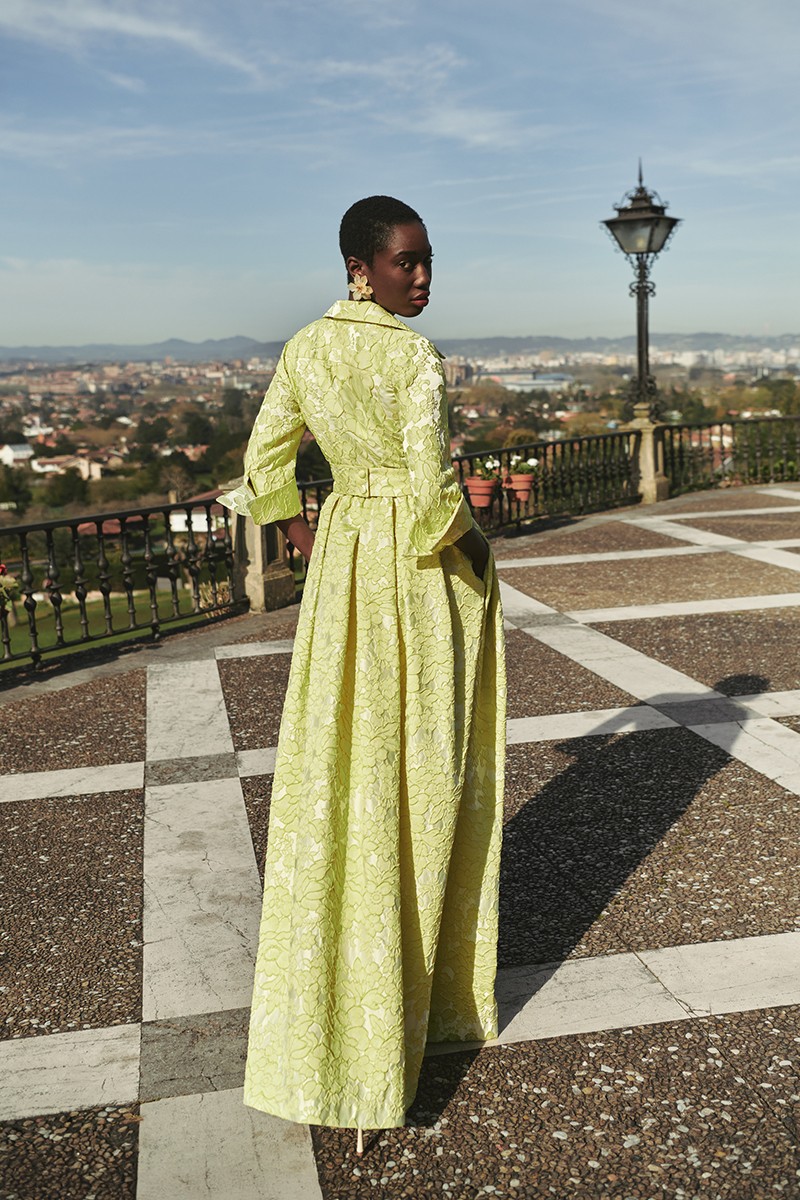 Vestido largo camisero confeccionado en un precioso tejido jacquard brocado lima con dibujos de flores en relieve. (...)