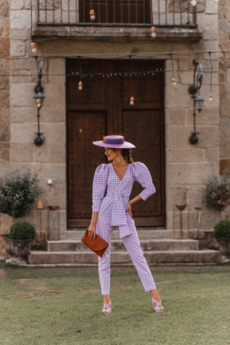 Precioso mono de cuadros vichy blanco y lila con escote en pico y mangas abullonadas. Lleva cinturón para atar en la parte delantera. (...)