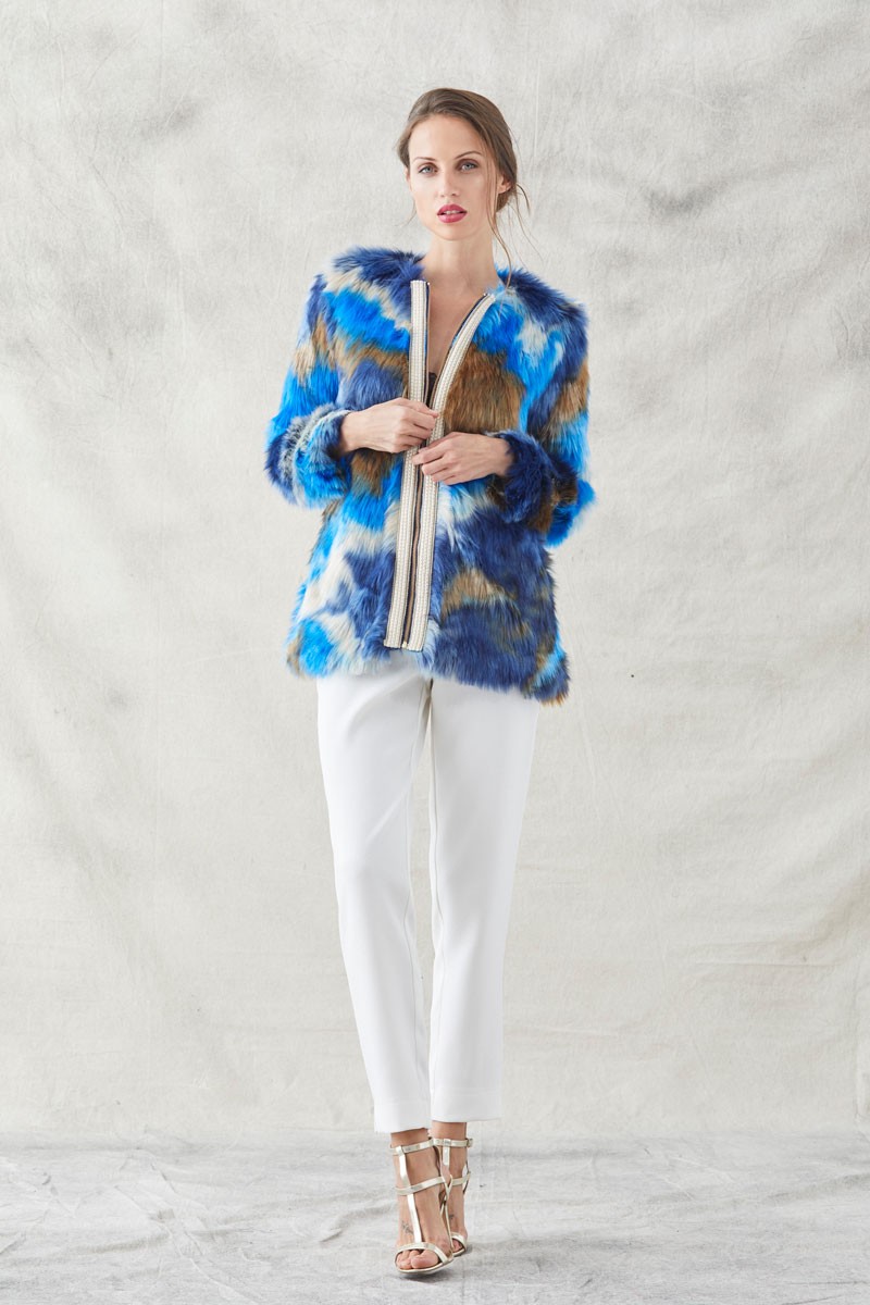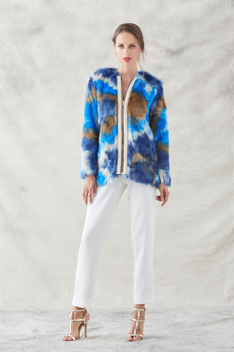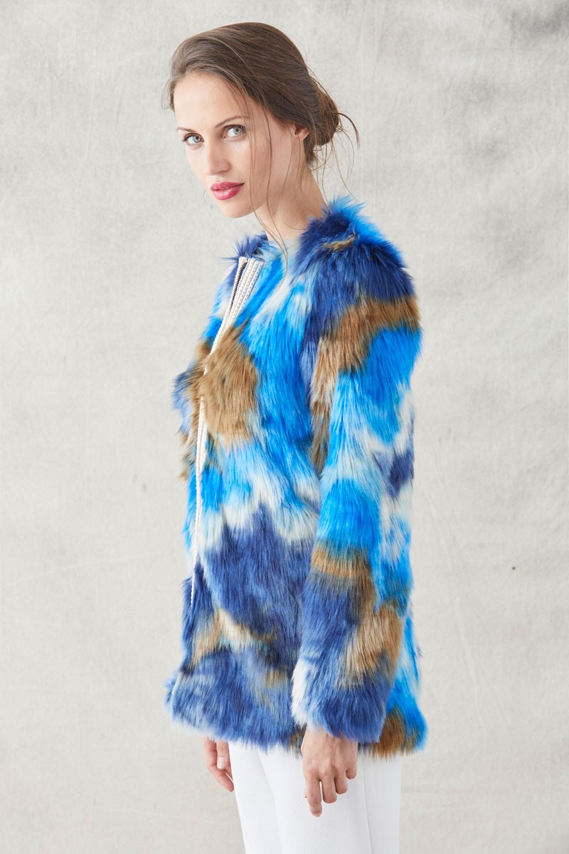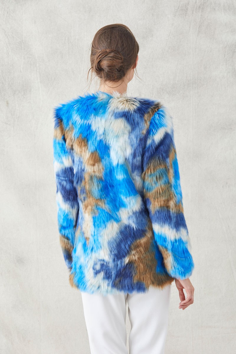 Precioso abrigo de pelo de visón sintético estampado que juega con los colores azul, marrón y beige en diversas tonalidades. (...)