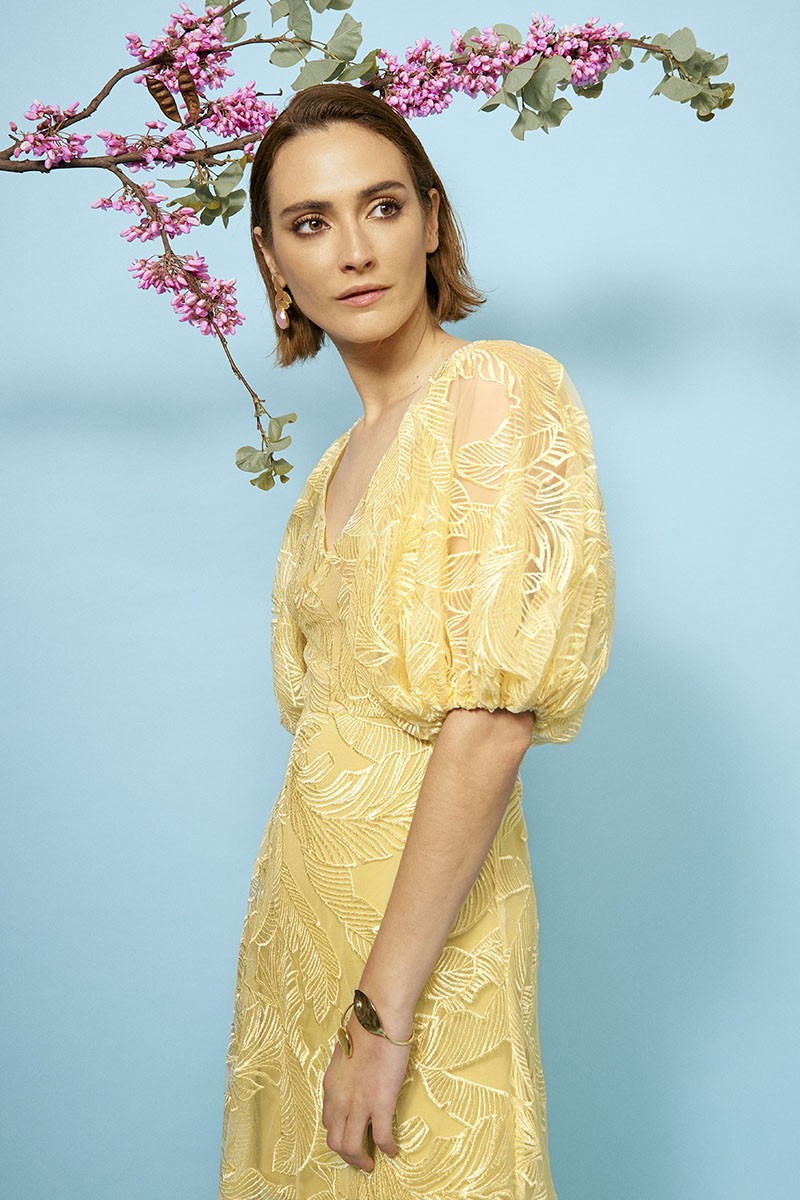 Impresionante vestido largo confeccionado en un tejido bordado con motivos florales de gran calidad en tonos amarillos. (...)