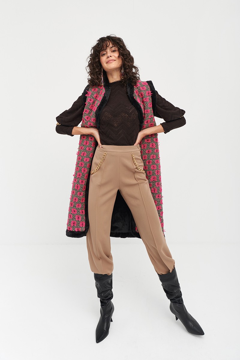 Precioso Pantalón ancho confeccionado en un tejido de algodón sostenible color camel, adornado con una preciosa cadena dorada. (...)